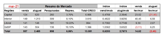 Na comparação com fevereiro, as vendas aumentaram 40,45% e as locações subiram 6,58%, comprovando a busca por casas e apartamentos nessa região do estado.