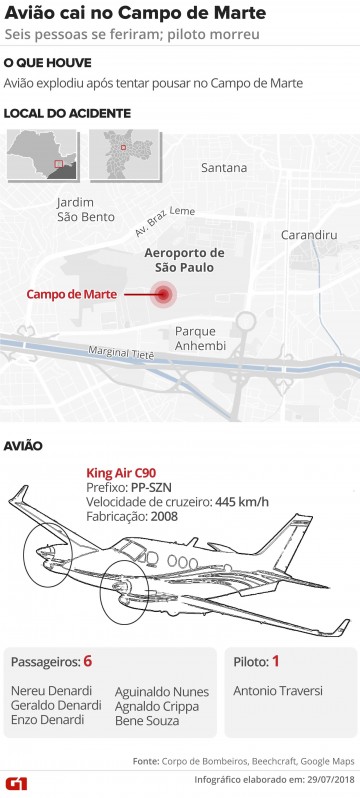 Uma pessoa morreu e seis ficaram feridas após a queda de uma aeronave de pequeno porte no Campo de Marte, na Zona Norte de São Paulo, no início da noite deste domingo (29). Houve uma explosão assim que o avião bateu no chão. Segundo os bombeiros, a vítima fatal é o piloto, Antonio Traversi.