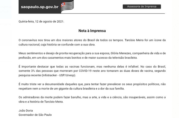 Em nota, o governador de São Paulo, João Doria (PSDB), lamentou a morte do artista. No texto, o governador também destaca que, no caso do Brasil, somente 3% das pessoas que morreram de Covid neste ano tomaram as duas doses da vacina, segundo dados do Info Tracker, projeto da USP/Unesp.
