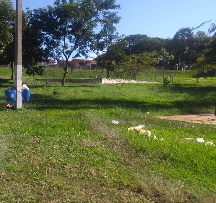Segundo os usuários, não existe zelador, as lixeiras estão cheias com lixo que está inclusive se espalhando pela grama, o campo de areia precisa de cuidados e as crianças que utilizam aquela área para brincar estão pegando bicho geográfico.