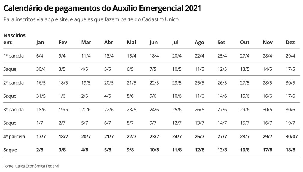Nesta quinta-feira (5), a Caixa Econômica Federal (Caixa) liberou os saques e transferências da quarta parcela do Auxílio Emergencial aos beneficiários que não fazem parte do Bolsa Família nascidos em abril, que receberam a parcela em poupança social digital no dia 21 de julho.
