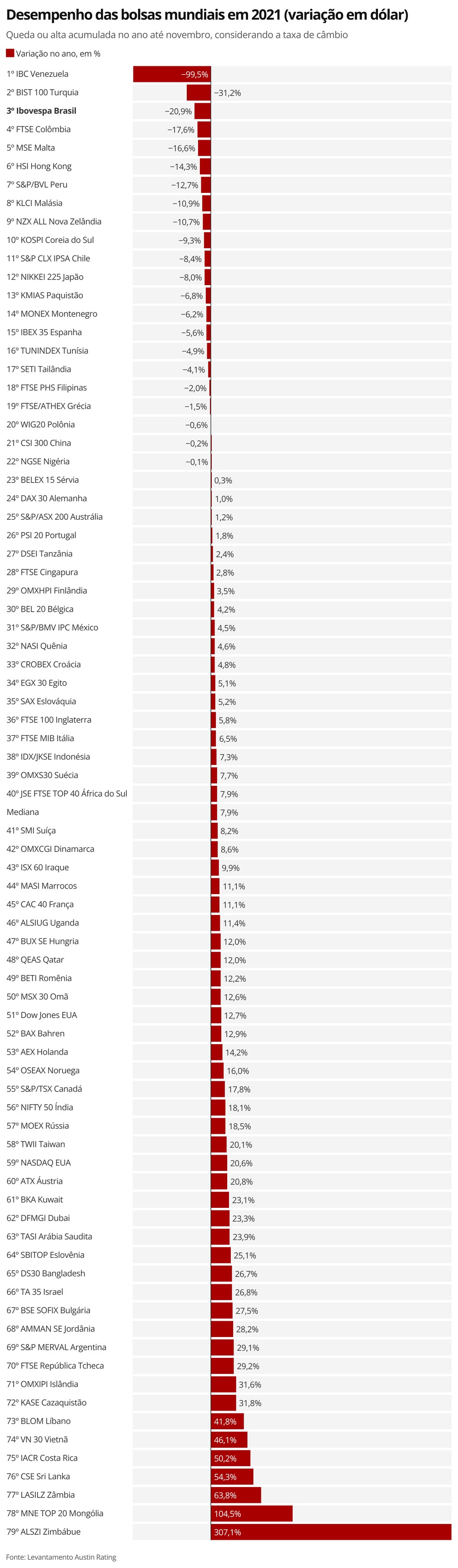 O levantamento mostra que, mesmo considerando a taxa de câmbio e a desvalorização de moedas como o real frente ao dólar, o Ibovespa permanece no pódio de piores desempenhos em 2021.