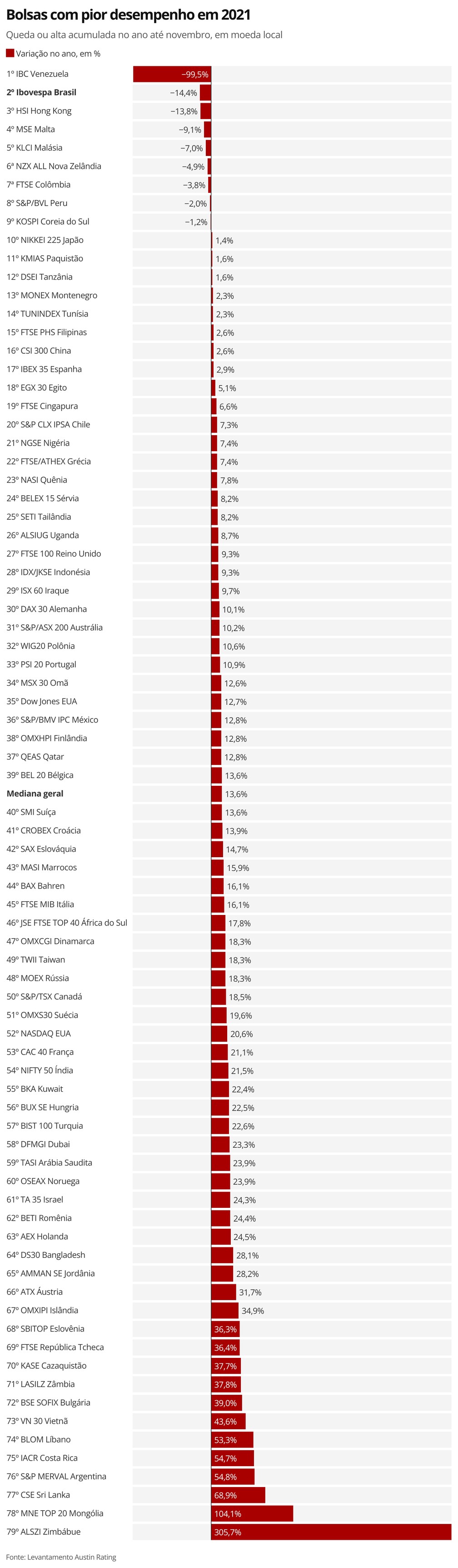 O Ibovespa, principal índice de ações da bolsa de valores de São Paulo, a B3, registra o segundo pior desempenho no mundo em 2021, atrás apenas da bolsa da Venezuela, segundo ranking da agência classificação de risco Austin Rating, feito com exclusividade a pedido do g1.