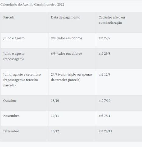 Os caminhoneiros que fizeram a autodeclaração até 7 de outubro podem receber a quarta, quinta e sexta parcelas. Em relação aos taxistas, coube aos municípios enviar, até o início de agosto, o cadastro dos permissionários ativos até 31 de maio.
