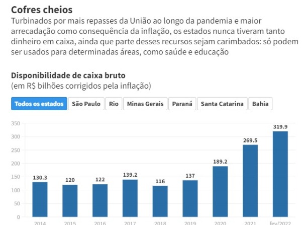 Em 2014, também ano eleitoral, os estados fecharam o ano com caixa bruto de R$ 130,3 bilhões, em valores corrigidos pela inflação, de acordo com o levantamento feito por Vilma Pinto. Esse número chegou ao menor patamar da série em outro ano eleitoral, 2018, quando a sobra foi de R$ 116 bilhões. A partir do ano seguinte, a folga começou a aumentar e chegou a R$ 269,5 bilhões, reflexo de mais repasses e alta da arrecadação.