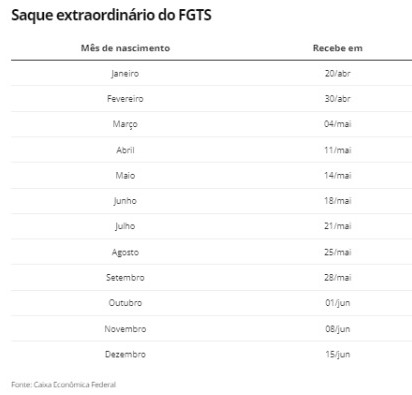 A liberação vai até 15 de junho, de acordo com o mês de nascimento do trabalhador. Confira, abaixo, o calendário, dividido por mês de nascimento: