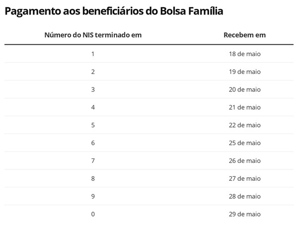 Para quem recebe o Bolsa Família, o calendário é diferente. Os beneficiários vão receber nas mesmas datas e da mesma forma em que recebem esse benefício, nos últimos 10 dias de maio. Já os saques em espécie começam na segunda-feira (18) para beneficiários com Número de Identificação Social (NIS) 1.