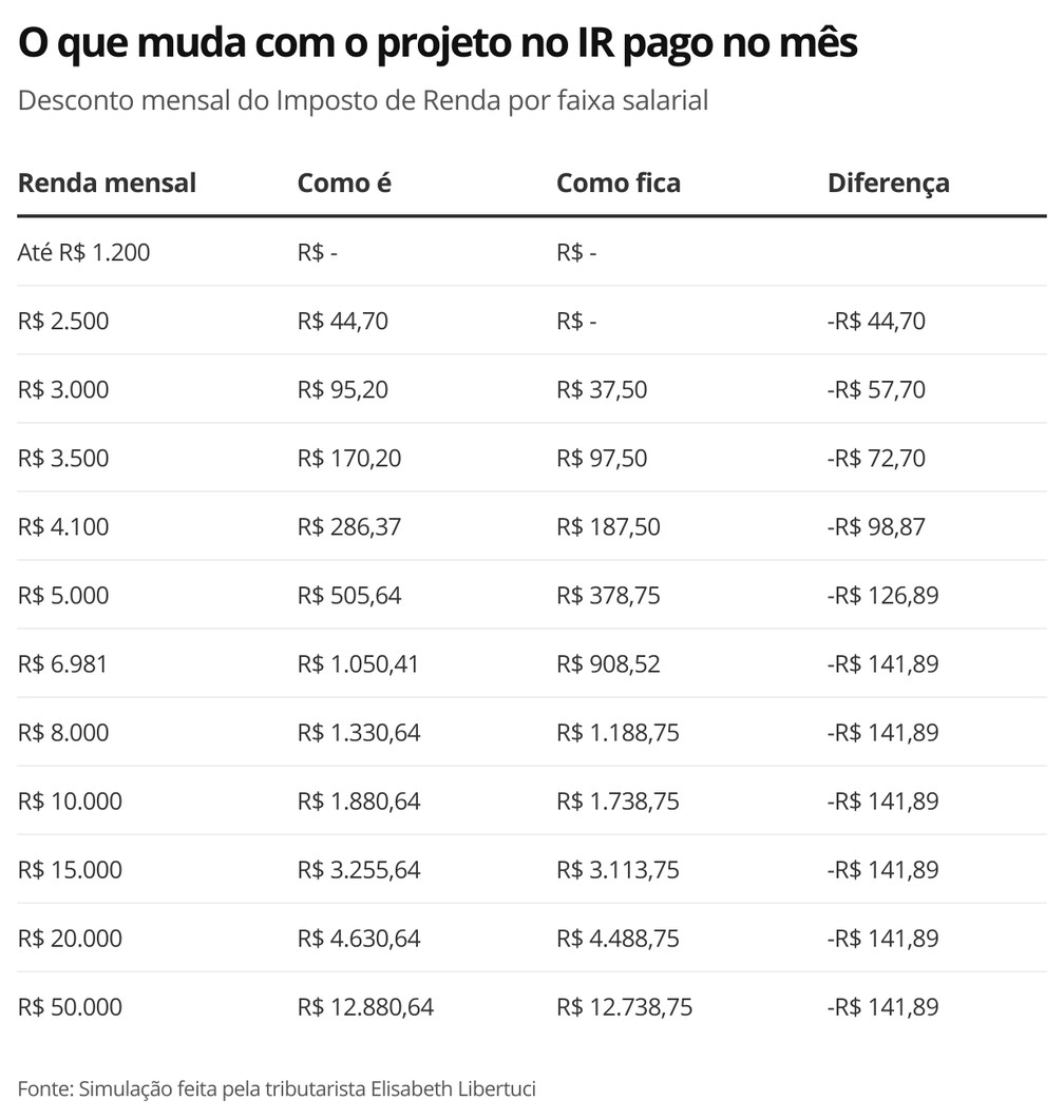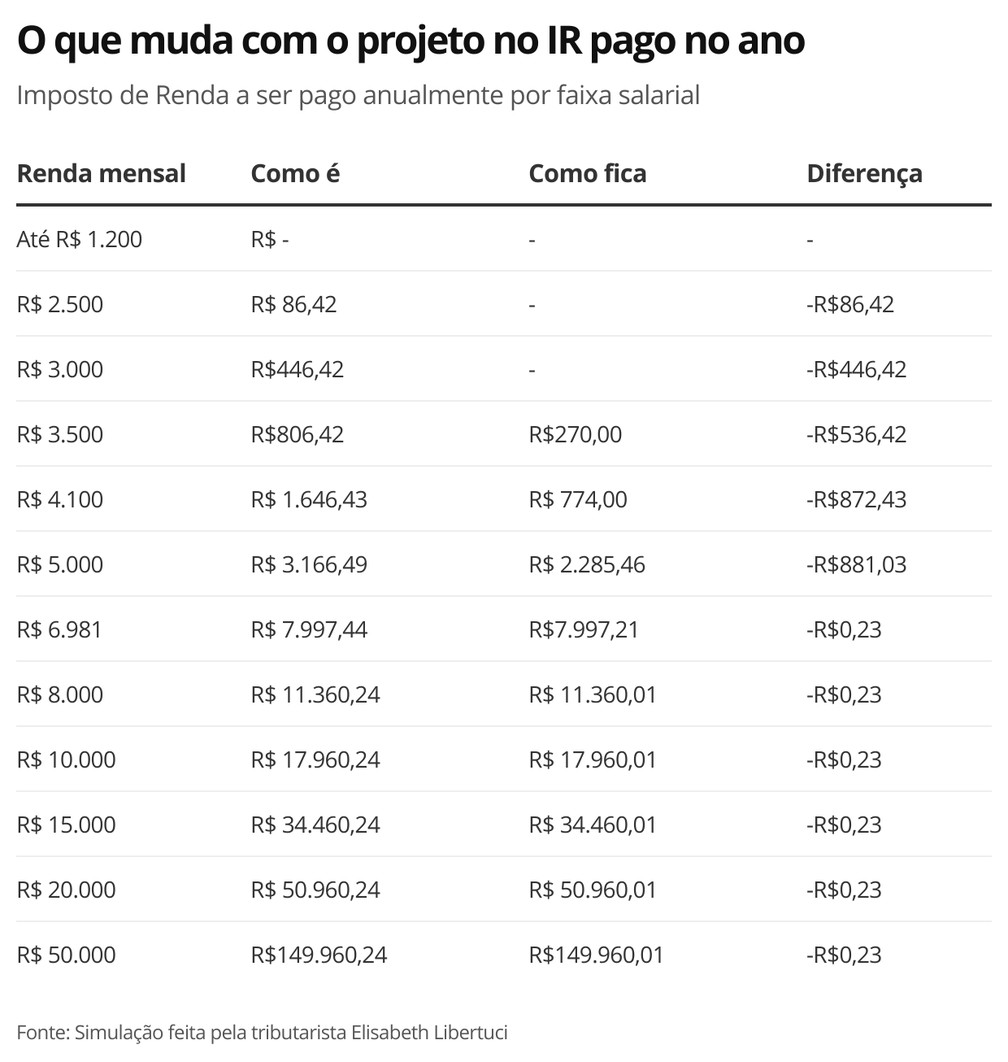 Uma análise feita pela tributarista Elisabeth Libertuci, tributarista especialista em pessoa física e sócia de Lewandowski Libertuci, mostra que a proposta reduz o valor de imposto de renda a pagar daqueles que recebem até R$ 6.980 por mês ou R$ 83,7 mil por ano.