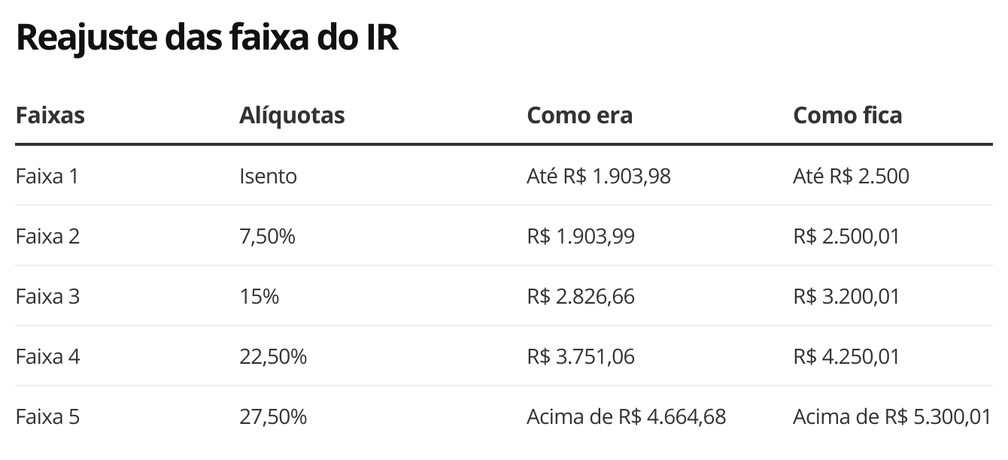 Com isso, os isentos passariam dos atuais 10,7 milhões para 16,3 milhões de pessoas. Já os demais trabalhadores celetistas teriam um desconto menor no contracheque. As demais faixas do IR seriam ajustadas, mas em menor proporção (cerca de 13%).