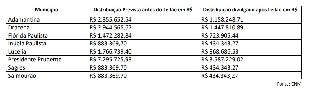 Como o leilão não alcançou o objetivo de arrecadação, o valor que os municípios irão receber é menor do que o montante previsto antes da realização do leilão. Porém, mesmo recebendo menos, os valores arrecadados com esse leilão foi o maior do setor de petróleo já realizado no mundo, segundo a CNM (Confederação Nacional dos Municípios).