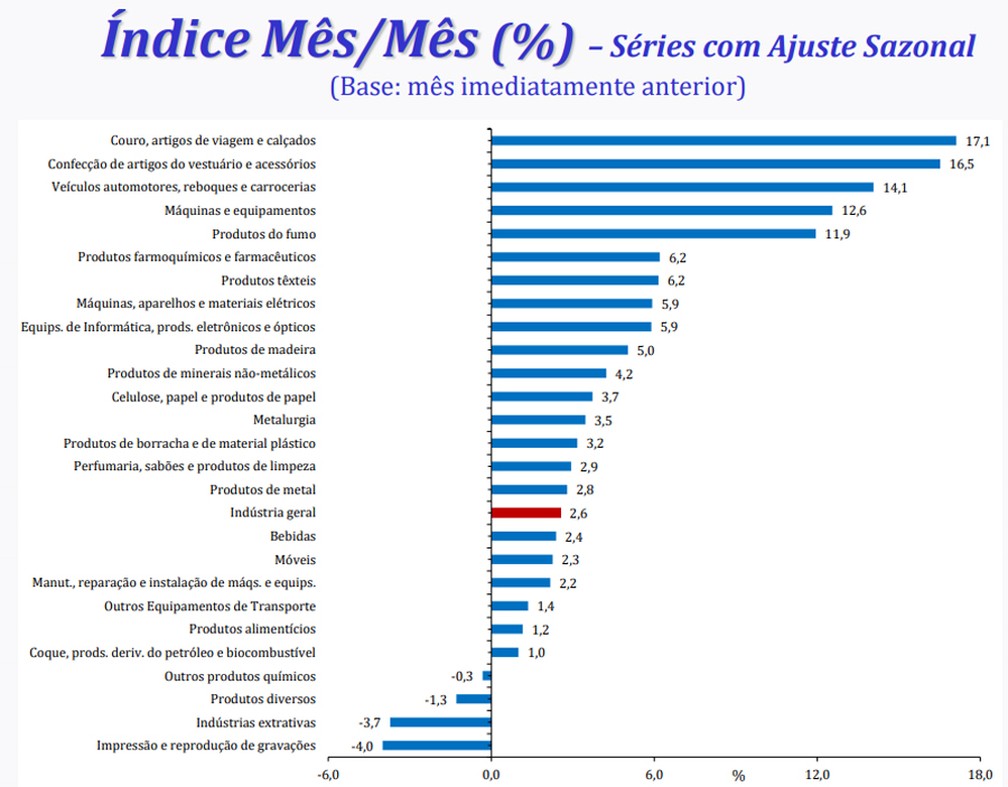 Por outro lado, houve queda em indústrias extrativas (-3,7%), impressão e reprodução de gravações (-4,0%), produtos diversos (-1,3%) e outros produtos químicos (-0,3%).