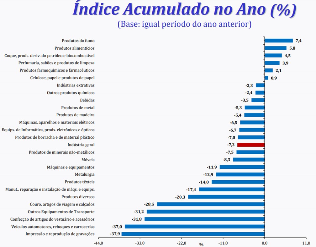 Entre os segmentos, as maiores baixas no acumulado no ano são na produção de impressão e reprodução de gravações (-37,9%), veículos automotores (-37%) e confecção de artigos do vestuário (-31,8%).