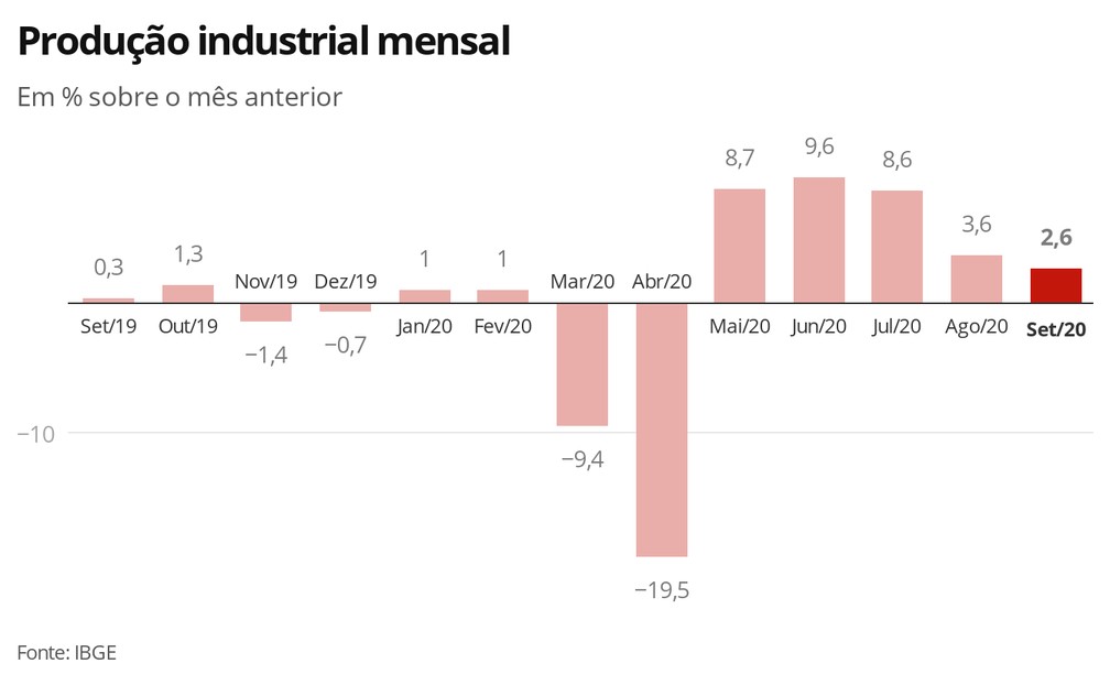 Com o resultado de setembro, a indústria acumulou em 5 meses um ganho de 37,5%, eliminando completamente as perdas registradas entre março e abril (-27,1%). Com isso, superou em 0,2% o patamar de fevereiro, quando a pandemia de coronavírus ainda não havia afetado a produção do país.