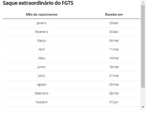 De acordo com o calendário dividido por mês de nascimento divulgado pelo governo federal, cerca de 3,7 milhões de trabalhadores nascidos em abril terão o dinheiro liberado na quarta-feira (11). Já os valores de 3,8 milhões que nasceram em maio serão liberados no sábado (14).