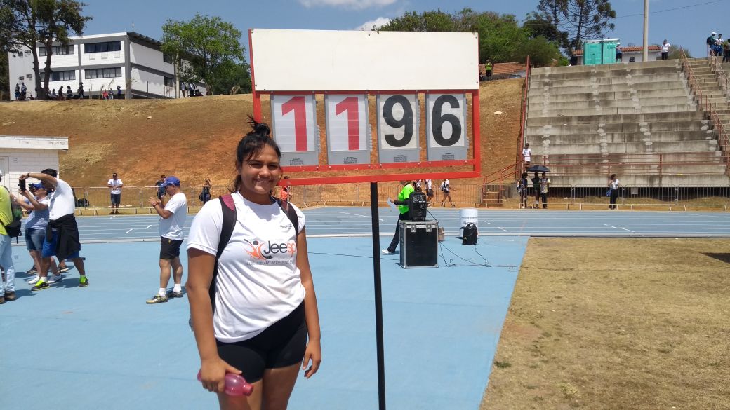 Em sua primeira participação nos Jogos Escolares, Isabela Leardini, da EE Benjamin Constant, foi campeã no Arremesso de Peso, ao alcançar a marca de 11m96cm.