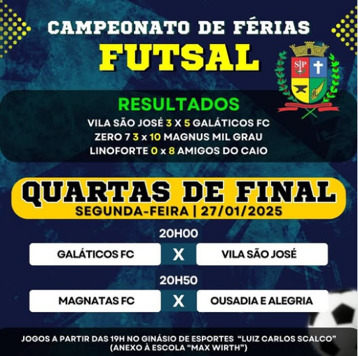 A primeira rodada da fase de quartas de final do Campeonato de Férias de Futsal, realizada na noite de segunda-feira (27), no Ginásio de Esportes "Luiz Carlos Scalco", ao lado da Escola Municipal "Max Wirth", foi marcada por muita emoção. As equipes "Galáticos" e "Magnatas" garantiram suas vagas nas semifinais, após vitórias em seus confrontos.