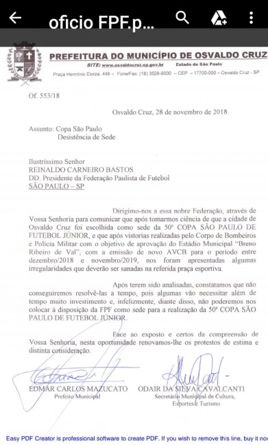 No documento, a argumentação é de que algumas adequações demandam tempo e investimento e, por isso, não seria possível estar à disposição da FPF para a Copinha.
