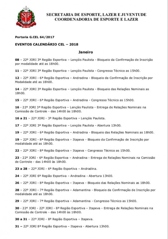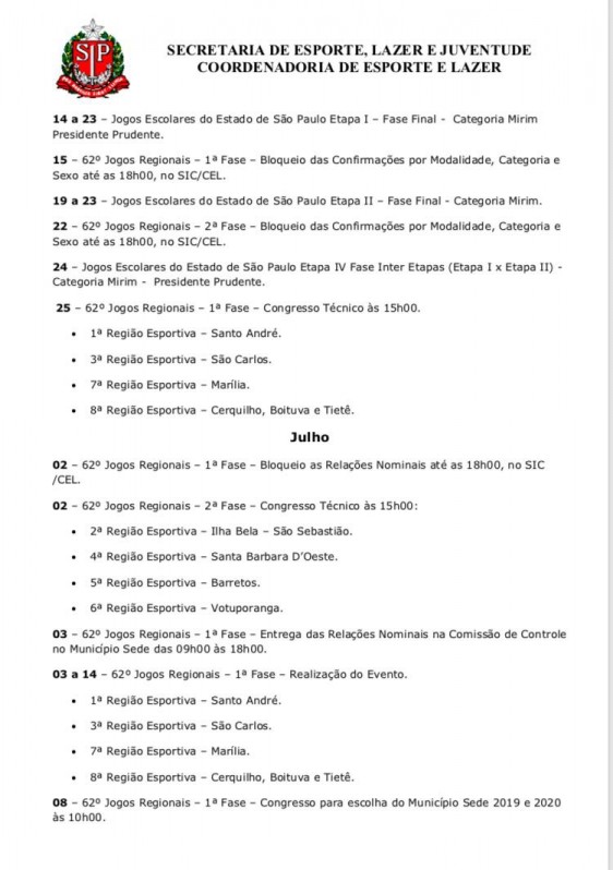 A Secretaria de Esporte, Lazer e Juventude e Coordenadoria de Esporte e Lazer do Estado de São Paulo, divulgou na tarde desta quinta-feira (30), o seu calendário 2018, onde aponta MarÃlia como sede dos Jogos Regionais em 2018, da 7ª região esportiva do estado.