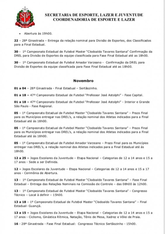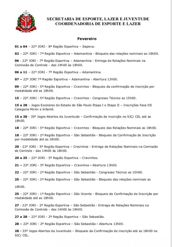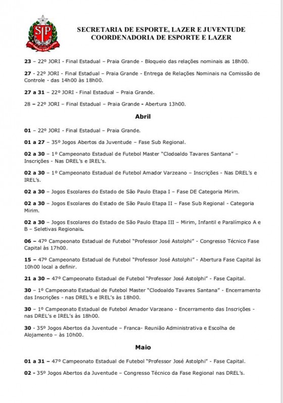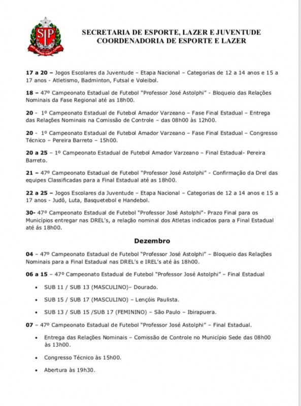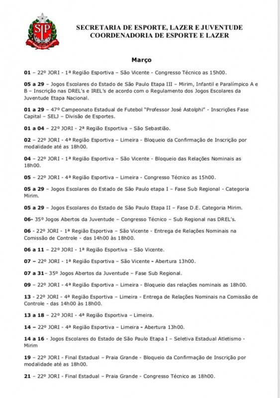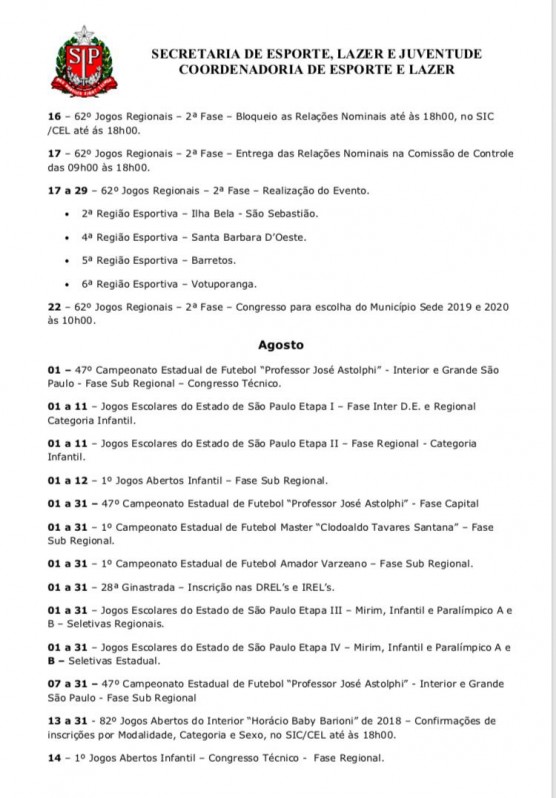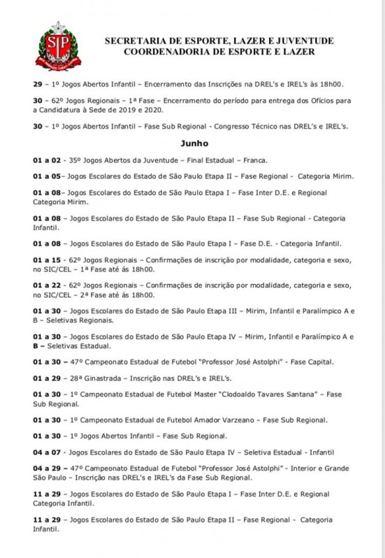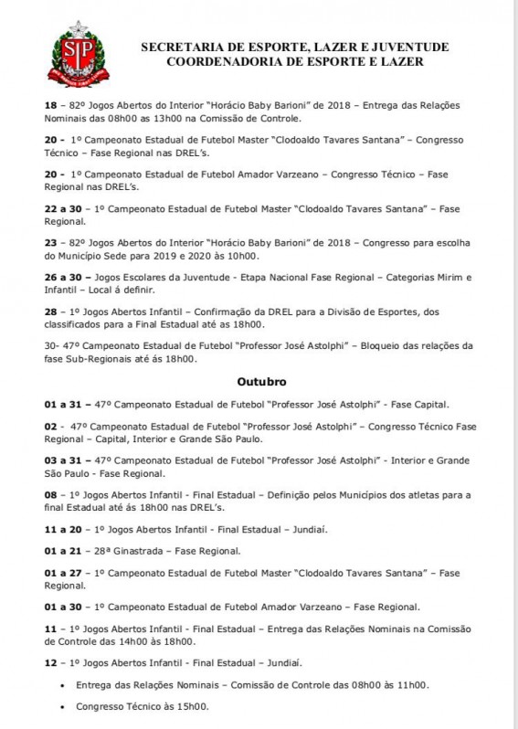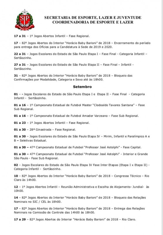 Em seu calendário, a Secretaria de Esporte, Lazer e Juventude e Coordenadoria de Esporte e Lazer, do estado de São Paulo, divulgou também algumas novidade para setembro, são elas: