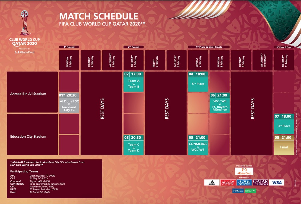 O Ahmad Bin Ali iria receber o primeiro jogo no dia 1 de fevereiro, mas com a saída do Auckland City, o Al Duhail, do Catar, avançou direto para a etapa seguinte. O campeão da Libertadores (Santos ou Palmeiras) estreia no dia 7 de fevereiro, no Education City. Esse será o mesmo palco da grande decisão do Mundial de Clubes, no dia 11 de fevereiro.