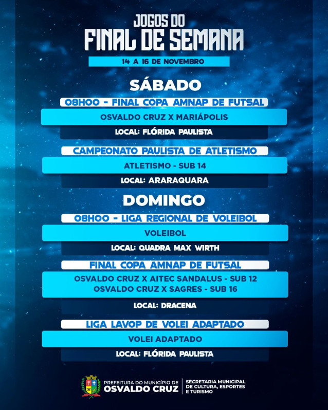 O município de Osvaldo Cruz será palco e participante de uma agenda esportiva repleta de emoções neste fim de semana, entre os dias 14 e 16 de novembro. A programação, que abrange futsal, atletismo e vôlei, promete movimentar atletas e torcedores, com disputas em diversas categorias e localidades.
