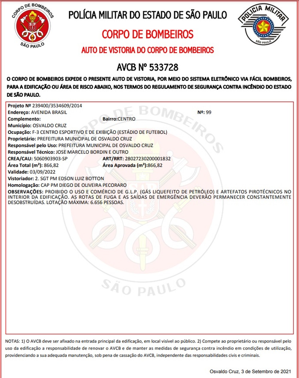 Já em relação ao Estádio Breno Ribeiro do Val (“Brenão”), cumpre esclarecer que a Polícia Militar cumpriu decisão judicial emitida pelo Excelentíssimo Juiz de Direito da Comarca de Osvaldo Cruz, que determinou a interdição do estádio, vedando a realização do jogo marcado para as 15h do dia 01/09/2021, ou qualquer outro jogo até a regularização do estádio.