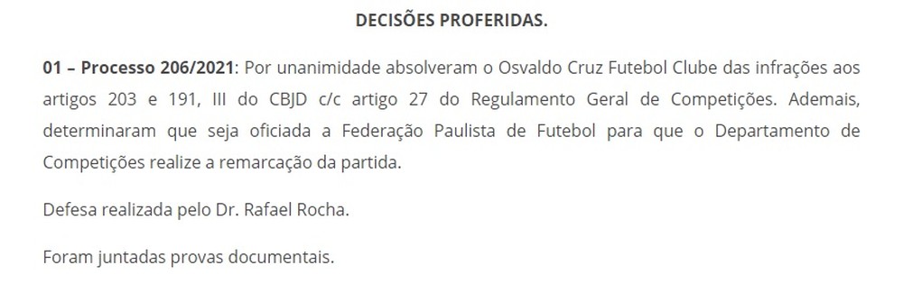 Nada de W.O.! O Osvaldo Cruz foi absolvido pelo Tribunal de Justiça Desportiva do Estado de São Paulo (TJD-SP). O julgamento na tarde desta sexta-feira (3) foi para decidir se haveria penalização ao clube por conta da não realização da partida pela quarta rodada do Campeonato Paulista da Segunda Divisão – quarto patamar estadual. Sem policiamento, não houve o duelo contra a Santacruzense, na última quarta (1º), no Estádio Breno Ribeiro do Val.