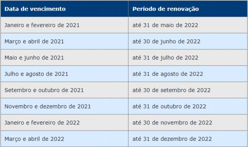 A norma foi estabelecida pela deliberação 243 do Conselho Nacional de Trânsito (Contran), de 09/11/21, que definiu um cronograma completo (veja abaixo) para CNHs que tiveram vencimento entre 1º. de março de 2020 e 31 de dezembro de 2022. O período para a regularização é feito com base no mês de vencimento do documento. Por exemplo, CNHs vencidas entre janeiro e fevereiro do ano passado deverão ser renovadas até 31 de maio de 2022.
