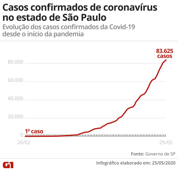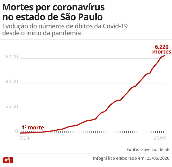 O estado de São Paulo chegou a 6.220 mortes causadas pelo novo coronavírus, segundo boletim da Secretaria de Estado de Saúde divulgado nesta segunda-feira (25). Foram 57 mortes em 24 horas, no domingo (24), eram confirmadas 6.163 mortes no estado.