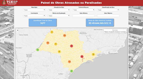O Tribunal de Contas do Estado de São Paulo (TCESP) disponibilizou, nesta quinta-feira (4), uma ferramenta que permite ao cidadão verificar a relação de todas as obras que se encontram atrasadas e/ou paralisadas nos municípios e no Estado. O mapa virtual (acesse aqui) aponta mais de 1.600 obras de infraestrutura que, juntas, representam mais de R$ 49,6 bilhões em investimentos.