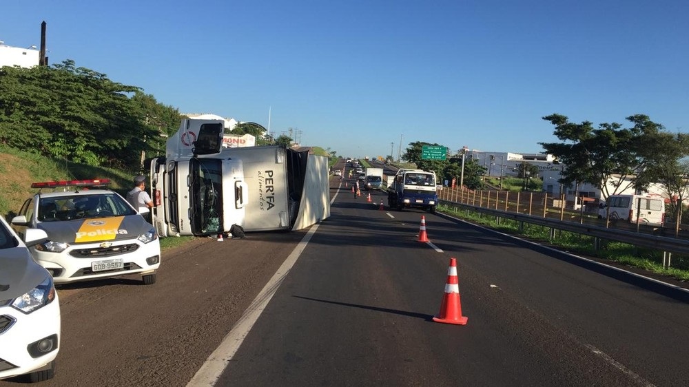 Um caminhão-baú carregado com eletrônicos tombou na Rodovia Raposo Tavares (SP-270), em Presidente Prudente, na manhã desta quarta-feira (17). O motorista sofreu lesões de natureza leve em um dos braços e foi socorrido e levado ao Hospital Regional (HR) para receber atendimento médico.