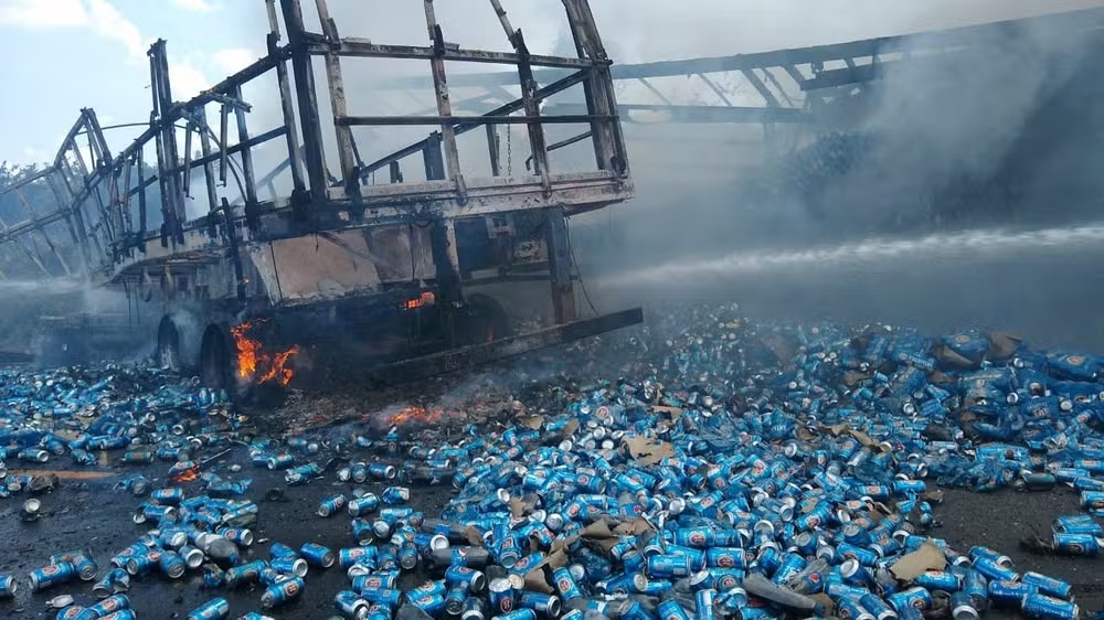 O motorista do caminhão de bebidas ficou preso às ferragens e morreu carbonizado.