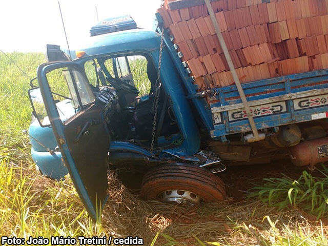 Em virtude da colisão, o caminhão, que estava carregado de blocos de cimento, perdeu o controle e foi parar em meio ao mato, na margem da rodovia.