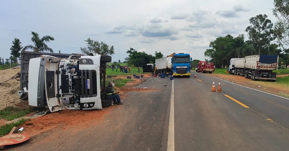 Os veículos trafegavam na via quando, na altura do km 59,500, nas proximidades do Rancho Quarto de Milha, houve um choque seguido de colisão lateral e tombamento de uma das carretas, de acordo com a Polícia Militar Rodoviária.