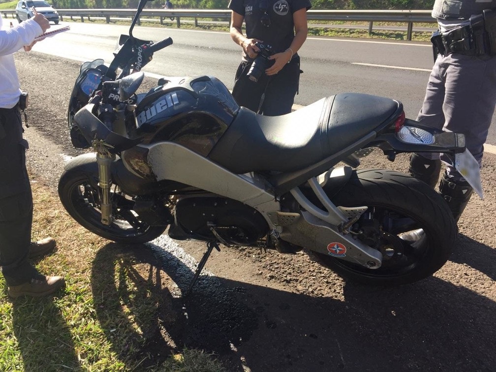 As marcas deixadas na rodovia indicaram que a moto derrapou na pista da esquerda e foi parar no acostamento do lado direito.