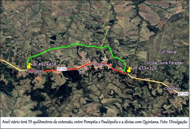 Conforme os estudos, o investimento na construção é de R$ 489,2 milhões, com prazo de execução de 13 meses. O anel viário terá 19 quilômetros de extensão, entre Pompéia e Paulópolis e a divisa com Quintana, a partir do trecho que compreende os quilômetros 476 + 480 metros e 494 da SP-294.