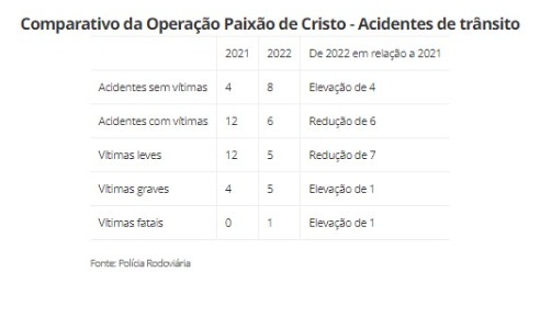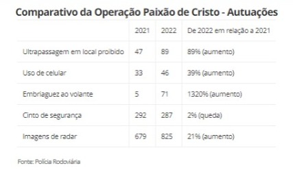Confira abaixo o comparativo de acidentes e autuações durante a Operação Paixão de Cristo em 2021 e 2022: