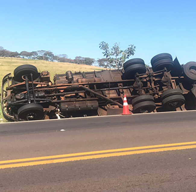 O motorista conseguiu sair da cabine e sofreu ferimentos leves. Com o tombamento, parte da carga ficou jogada para fora do veículo.