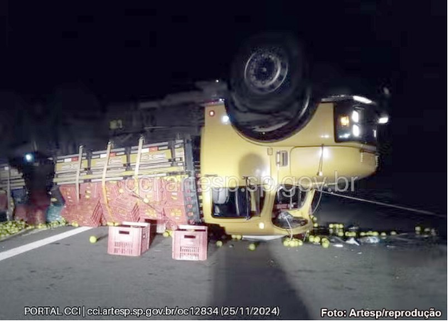 De acordo com informações da Artesp, o motorista perdeu o controle do veículo e tombou entre o canteiro e a faixa, bloqueando todas as faixas. A carreta ficou completamente virada na pista.