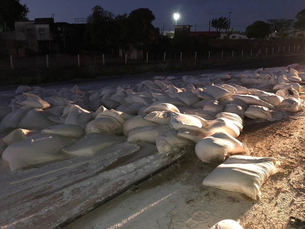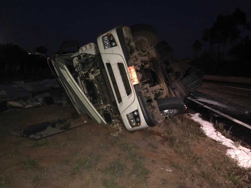Um caminhão carregado com farinha de trigo tombou na manhã desta segunda-feira (15) entre o aeroporto e o trevo de Presidente Prudente. O acidente causou leves ferimentos no motorista.