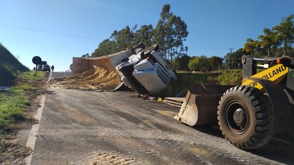 O caminhão estava carregado de gesso agrícola e parte da carga ficou espalhada pela via.
