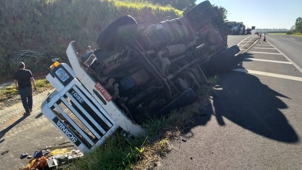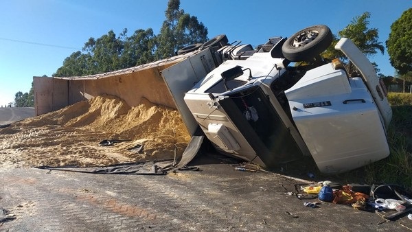 Uma carreta tombou no início da noite desta segunda-feira (24) na Rodovia Assis Chateaubriand (SP-425), no trevo do município de Indiana.