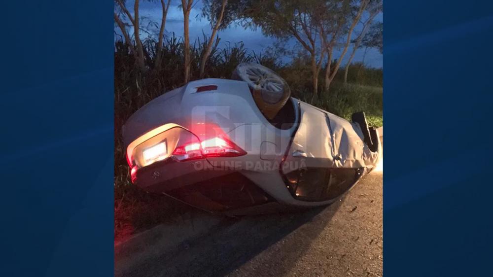 Após capotar, o veículo foi parar na contramão de direção, com as rodas para cima e dentro da canaleta de escoamento de águas pluviais.