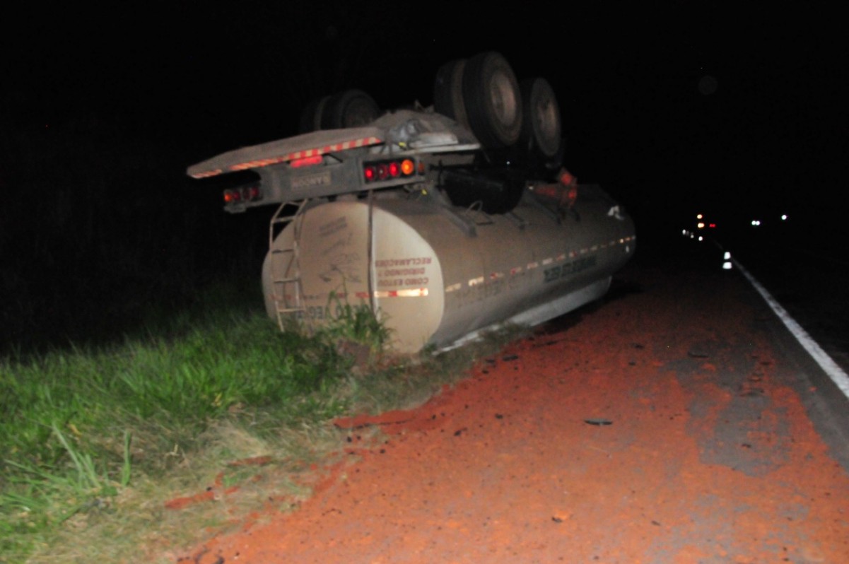 Uma carreta bitrem que transportava óleo vegetal tombou na noite desta quarta-feira (25) no km 367,700 da Rodovia Assis Chateaubriand, trecho pertencente ao município de Rinópolis.