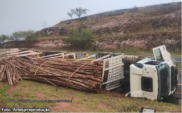 Uma carreta carregada de madeira tombou na Rodovia Comandante João Ribeiro de Barros (SP-294) na manhã deste sábado (26), em Gália (SP). Ninguém se feriu.