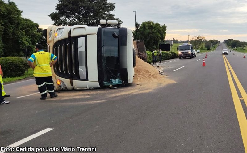 Na manhã desta terça-feira, dia 7, um caminhão bitrem, que transportava uma carga de farelo de amendoim, tombou na alça do trevo de acesso a Iacri (SP), na Rodovia Comandante João Ribeiro de Barros (SP-294). As informações iniciais são de que o motorista de 54 anos, morador em Assis (SP), sofreu ferimentos leves.