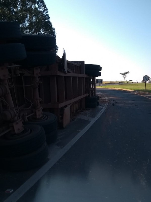 Uma unidade de um conjunto bitrem, com carga de bagaço de cana, tombou na manhã desta quarta-feira (7) na Rodovia Comandante João Ribeiro de Barros (SP-294), altura da rotatória de acesso à Rodovia Plácido Rocha/Bairro Lagoa Seca, em Adamantina.