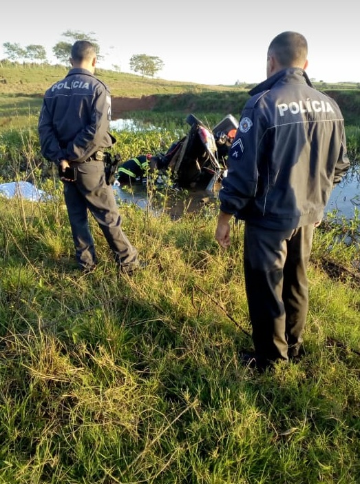 O vídeo traz ainda imagens de uma das vítimas presas às ferragens, outra submersa na água e a terceira a alguns metros do veículo entre a água e a vegetação.