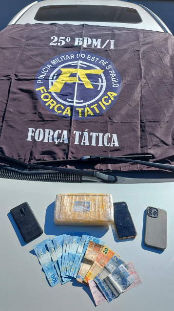 Além da droga, os policiais também apreenderam uma folha de cheque no valor de R$ 1.175,00, a quantia de R$ 876,00 em dinheiro e três aparelhos celulares.