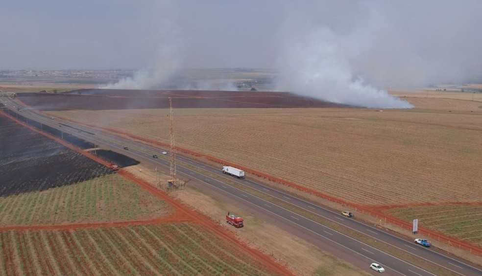 Imagens feitas por drone mostram a área destruída por uma queimada registrada às margens da Rodovia Comandante João Ribeiro de Barros entre Pederneiras e Jaú (SP). O incêndio começou no fim da manhã de domingo (27).